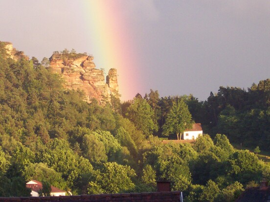 Unsere 83 qm große Ferienwohnung besteht aus einem großen Wohn-Esszimmer mit Kaminofen und Zugang zum Südbalkon. Aussicht auf Hochstein-Lämmer-Büttel- u. Sängerfelsen sowie die Stadt Dahn. Es gibt eine Küche mit Essplatz, 1 Schlafzimmer mit Doppelbett, 1 Schlafzimmer mit Bett 1,4m x 2,0m, Duschbad sowie separates WC, Waschmaschine, W-LAN, SAT-TV, DVD, CD-Radio, Mikrowelle.